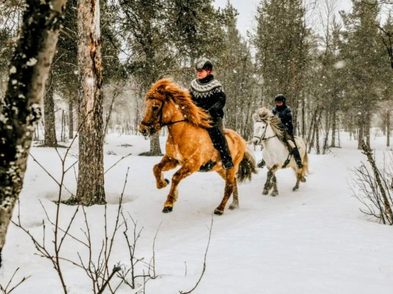 Far from light pollution, horseback riding through the Arctic taiga allows you to observe the Northern Lights in their full splendor. Over frozen lakes and untouched snow, the lights not only illuminate the sky but also reflect off the ice, creating the unique sensation of riding within the natural spectacle.